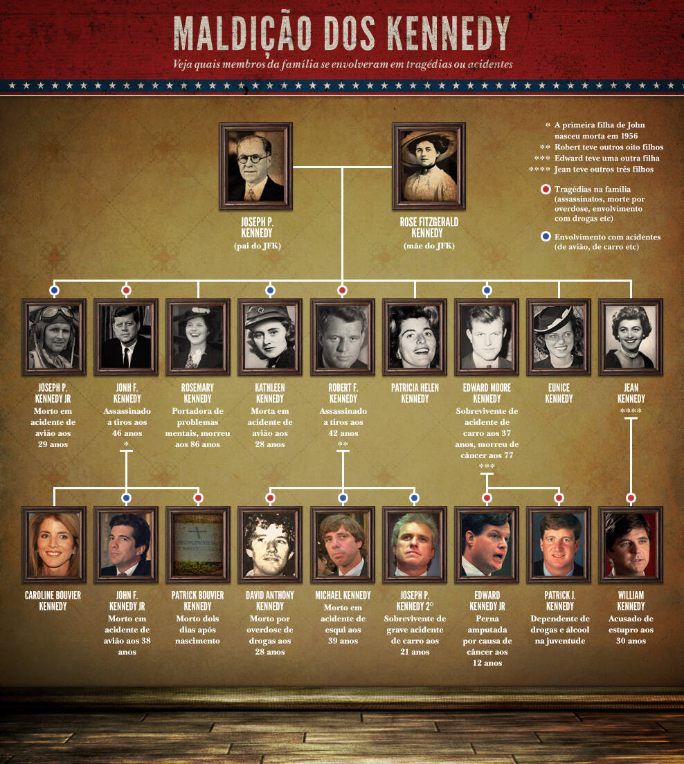 Além de Jonh F. Kennedy, assassinado aos 46 anos durante um desfile em carro aberto em Dallas há 50 anos, quando era presidente dos EUA, outros sete membros da família tiveram mortes prematuras e trágicas, além de seis casos de acidentes, doenças e envolvimento com drogas.