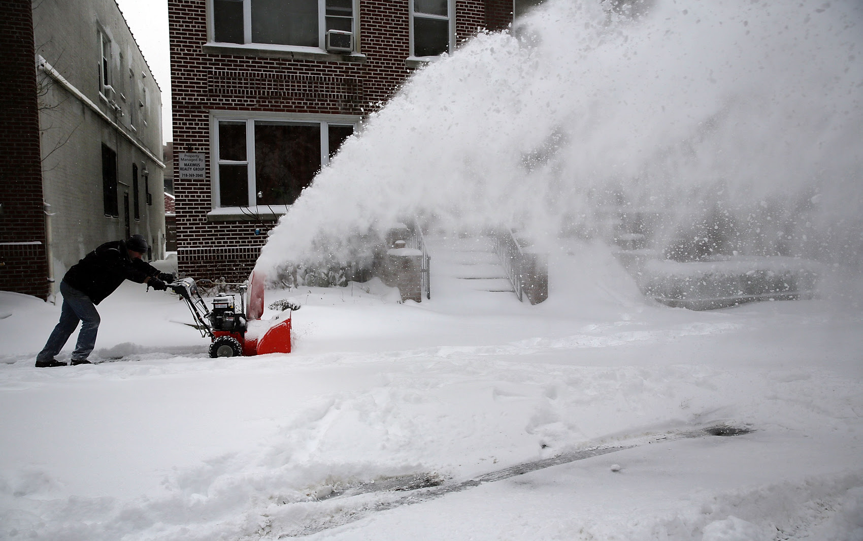 Trabalhadores removem a neve acumulada em uma calçada de Detroit, no estado de Michigan.